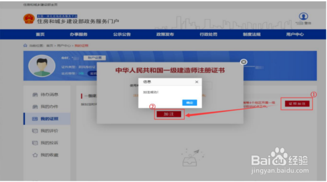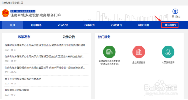 然后依次选择“一级建造师”→“个人入口”后,跳转至“住房和城乡建设部政务服务门户”,如下图所示: