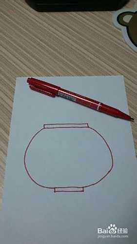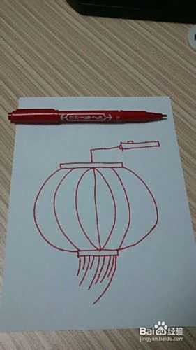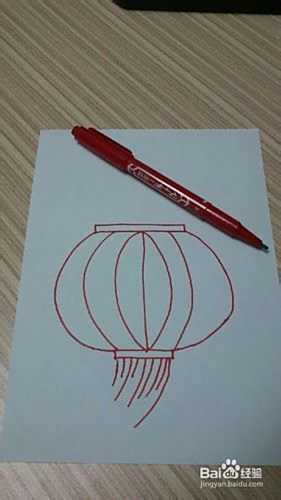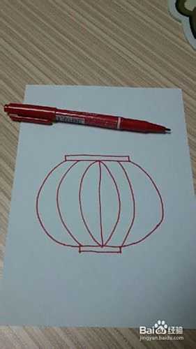 在大椭圆形的中间画一条直线,直线的两个顶点左右分别画出两条弧线哈,再从底部滴小长方体滴上两点画出两条弧线分割一下灯笼哦~