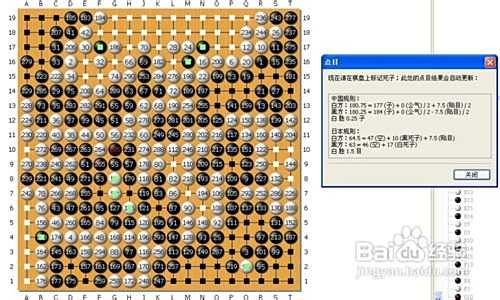 如果数的是黑棋,再减去3又3/4子,如果数的是白棋,再加上3又3/4子。第四步,结果和180又1/2(棋盘361个点的一半)比较,超过就算胜,否则判负。