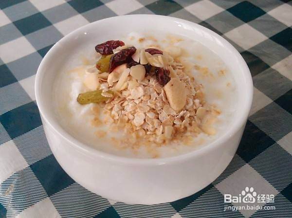 水果(可以随意搭配、酸甜口味比较合适)切小块、几颗坚果(一定不能多)、一盒100g左右的酸奶