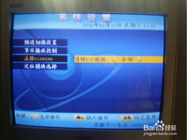 通过遥控器上下键选择第三行“清除EEPROM信息”后再通过遥控器左右键选择“全部”。