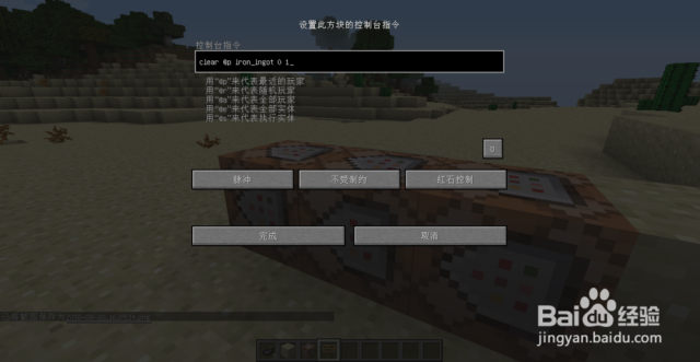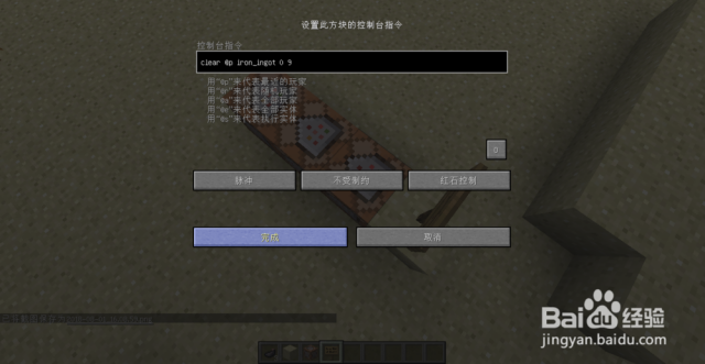 然后我们点击第一个(最里面的)命令方块,输入如下指令:clear @p iron_ingot 0 9(不需要加斜杠),点击完成。