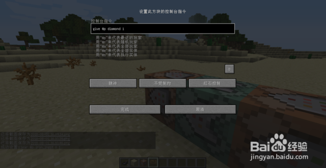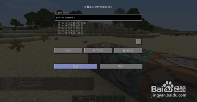 解析:give是给予玩家物品的指令,diamond是钻石,1是物品数量。这个指令就是给予最近的玩家1个钻石。然后像第4步一样,把三个按钮分别调成“连锁”“条件制约”“保持开启”。