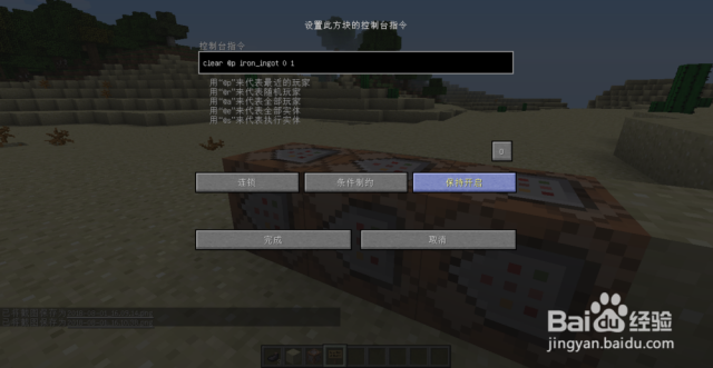 然后我们点击第二个命令方块,在指令中输入clear @p iron_ingot 0 1。这里的清除数量必须是1。接着,我们把中间的三个按钮分别调成“连锁”“条件制约”“保持开启”。