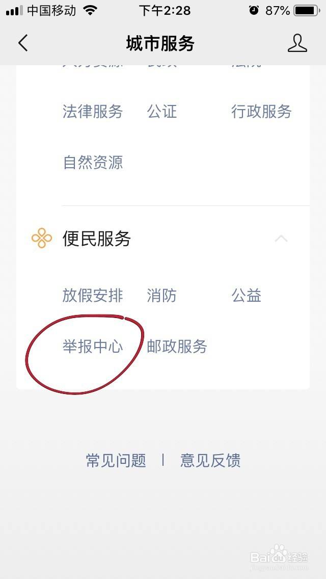 [图]5/8找到便民服务,选择其中的举报中心选项打开。