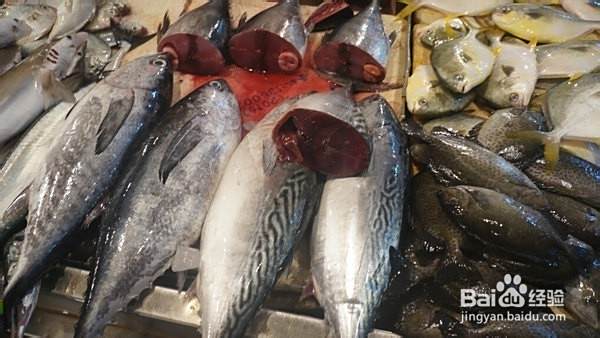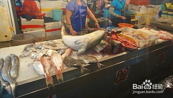 市场里卖死鱼的摊位。但是我还是介意去旅游的人买生猛活的海鲜吧~~这样营养更丰富,口感更鲜美!