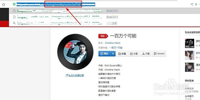 6、此时,将网页“地址栏”中网址的字符串“/#/song?id”改成字符串“/song/media/outer/url?id”。