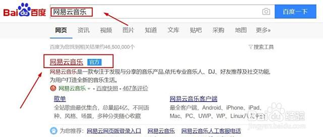 1/11、打开“浏览器”,打开“百度”网页,在搜索框内输入“网易云音乐”,点击“网易云音乐官网”。