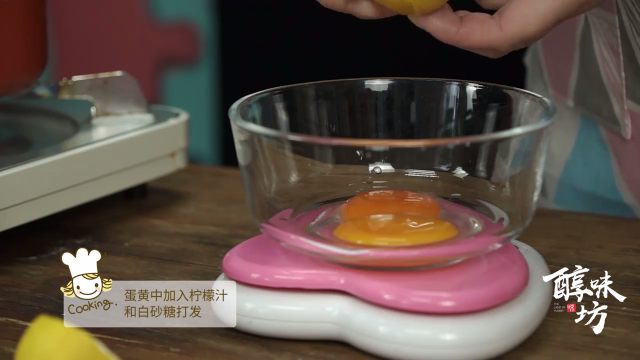 [图]2/5蛋黄中加入白砂糖和柠檬汁打发,50g纯牛奶倒入锅中加热,趁热倒入蛋黄液中搅拌均匀。