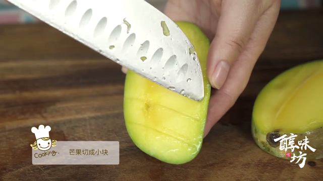 [图]4/5芒果切成小块放入料理机打成泥后,倒入冰激淋液中搅拌均匀。倒入密封的容器中,再放入冰箱中冷冻一晚,冷藏定型后根据自己喜欢的口味即可食用。