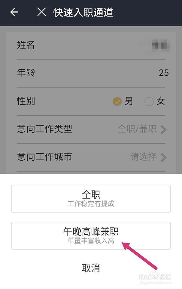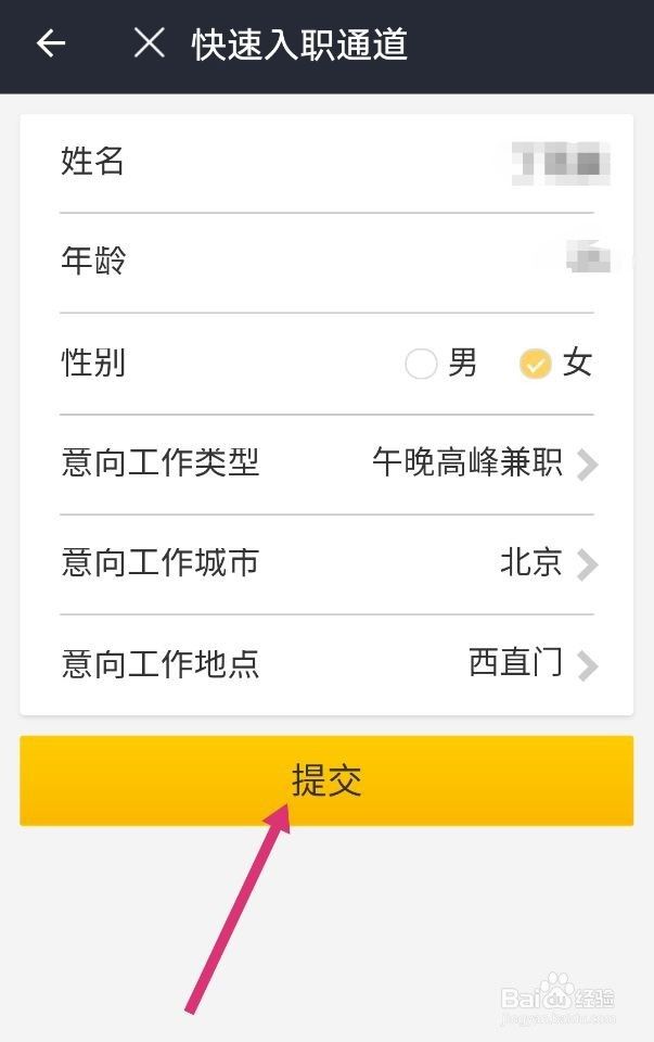 [图]5/7输入自己的姓名、年龄、性别,在选择工作意向时,如果是做临时的,就选择兼职。