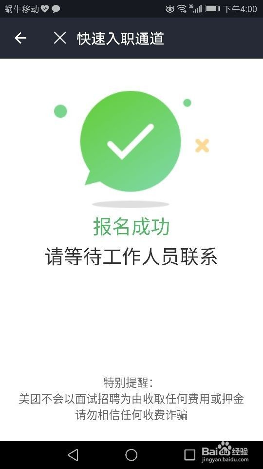 [图]7/7提交成功后,会显示报名成功的界面。一般三个工作日内就会收到面试的通知电话,去参加面试,面试时带上自己的身份证原件和复印件。